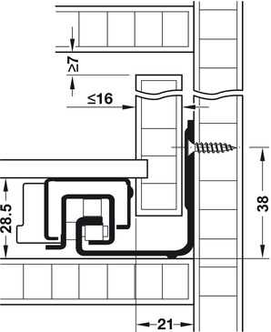 Groter bewegingsgemak licht openen, aangenaam rustige loop en zacht sluiten eenvoudig en variabel af te stellen stabiel en precieze loop, dankzij minimale dalingswaarden Instelmogelijkheid max. hoogteverstelling +3 mm bij de ladegeleider max. zijverstelling ± 1,5 mm bij de koppeling. Materiaal Staal. Oppervlak voorverzinkt. Afmetingen max. ladebreedte SB = binnenwerkse corpusbreedte – 42 mm + 2 x ladezijkantdikte tolerantieweergave: breedte +0/–1,5 mm, diepte ± 2 mm frontvoeg: 0 mm bij Blumotion, 3,5 mm bij Tip-On, 2,5 mm bij Tip-On Blumotion