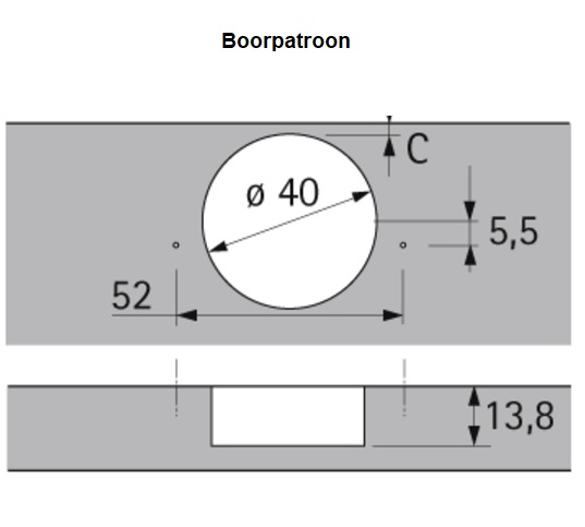 Voor deurdikte 16 - 43 mm met potdiameter 40 mm. potdiepte 13,7 mm. Geïntegreerde opdekverstelling + 0,5 mm / - 3 mm. Geïntegreerde diepteverstelling 4 mm. Hoogteverstelling via montageplaat.